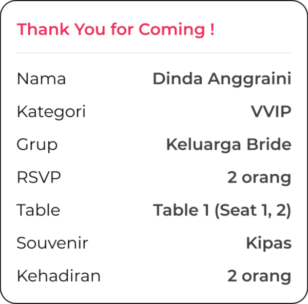 Permudah pencatatan kehadiran tamu di hari istimewa kamu dengan QR Check-in yang real-time, akurat, dan super aman! Bikin setiap kehadiran lebih spesial dengan fitur Selfie Check-in dan Auto Thank You Message!