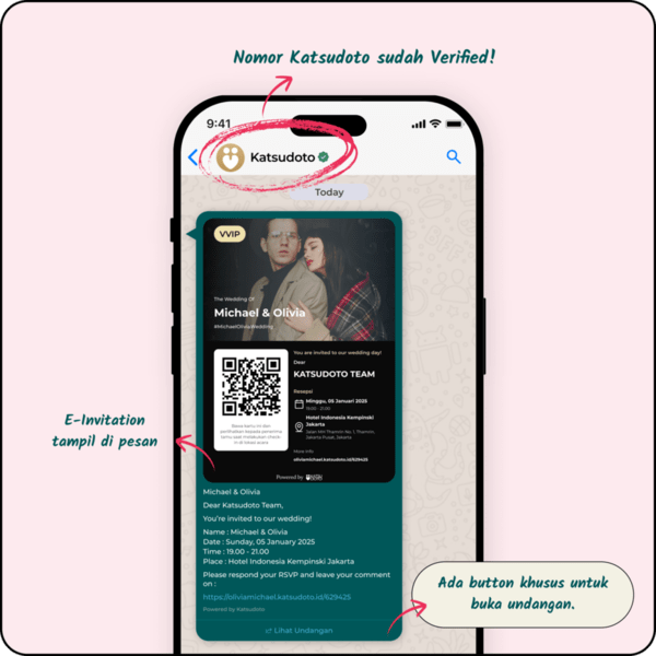 Setelah pesan undangan diterima, tamu kamu juga akan menerima E-invitation berisi ringkasan acara dan QR Code untuk bisa masuk ke acara.